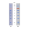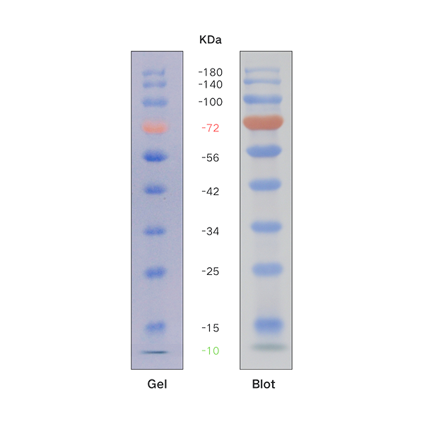 10条参考条带分别与蓝色、绿色和红色发光基团共价键连接,其中绿色蛋白条带代表分子量10kDa;红色蛋白条带代表分子量72kDa,其余条带均为蓝色。
